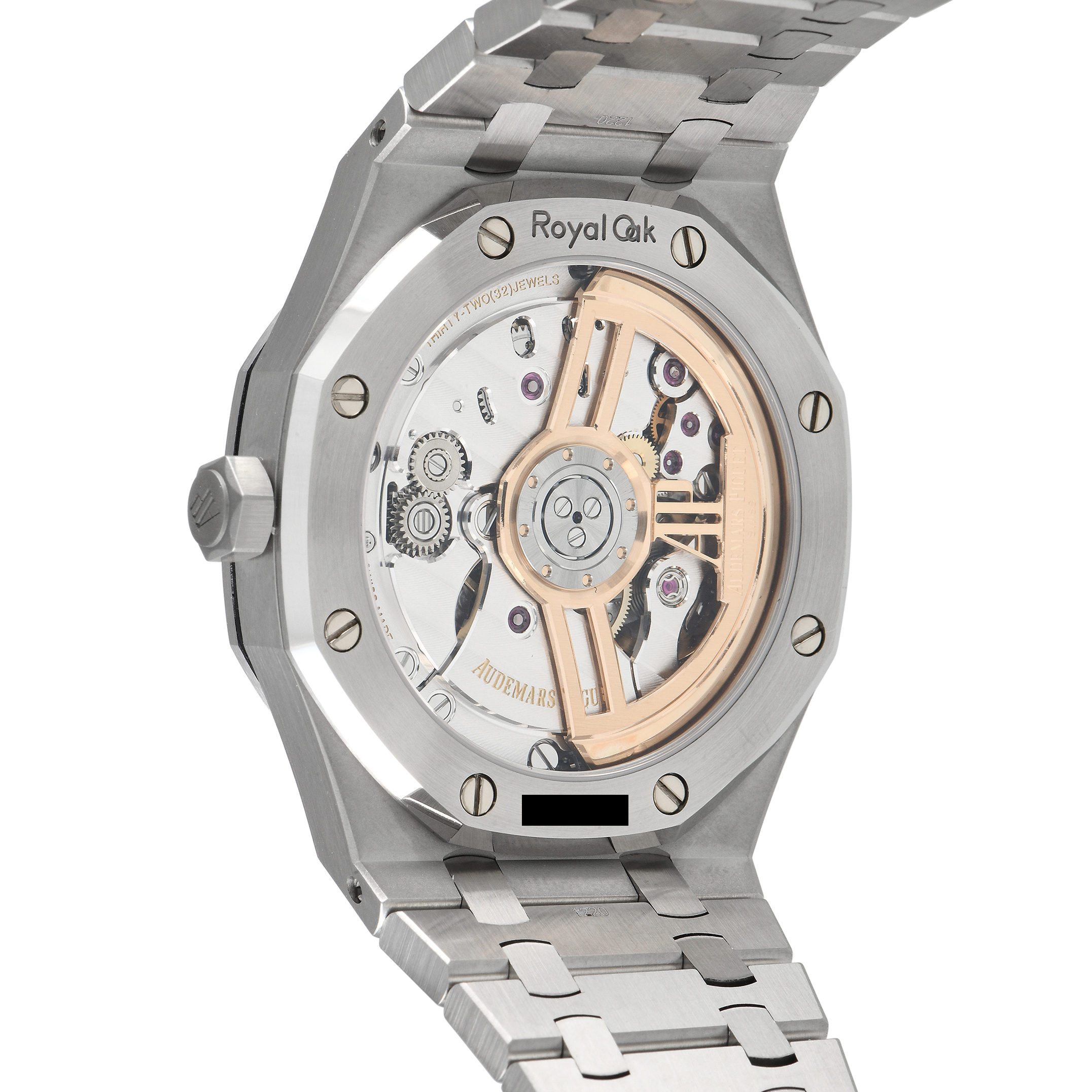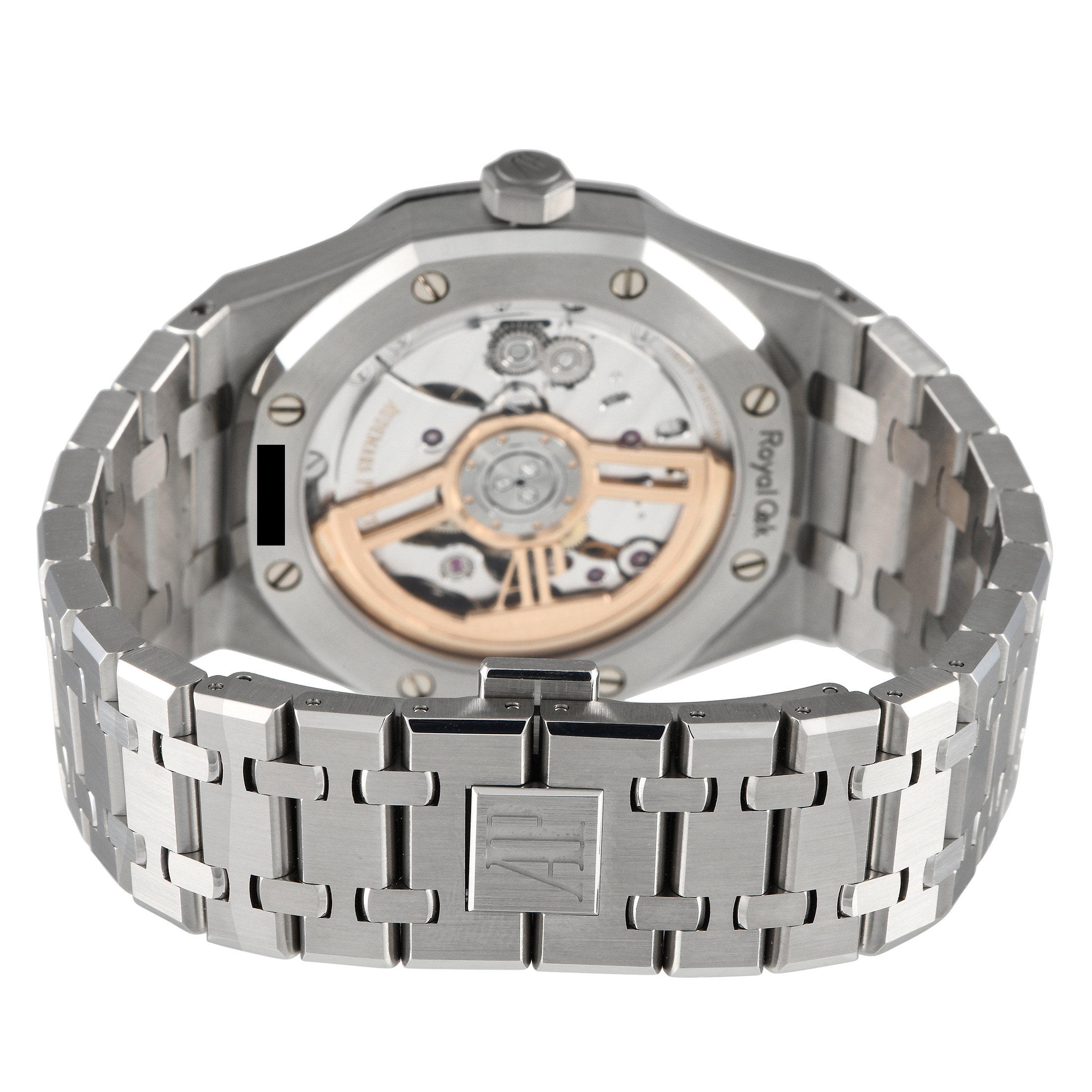 A basic, rugged steel watch flawlessly assembled and finished to serve you for years. The Audemars Piguet Royal Oak 15500ST has a 41mm steel case with the signature octagonal bezel and an integrated bracelet. It is equipped with an in-house movement, caliber 4302 that has a 4Hz frequency and a 70H power reserve. The face of the watch displays a Grande Tapisserie pattern in blue surrounded by a smooth minute train with white printed markers. The date window takes a discreet position at 3 o’clock.