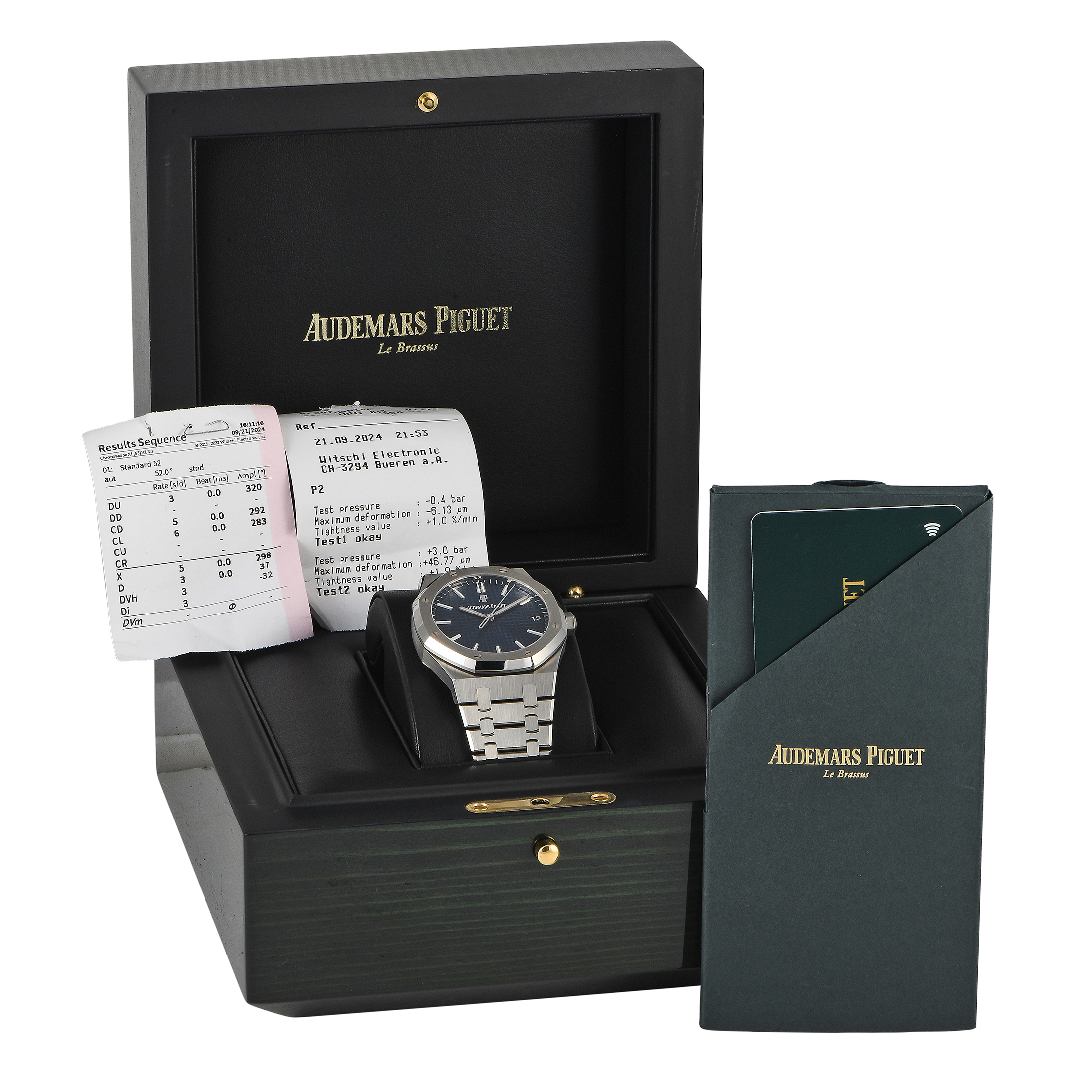 This pre-owned Audemars Piguet Royal Oak Blue Dial Watch 15500ST.OO.1220ST.01 comes with papers and the manufacturer’s box.