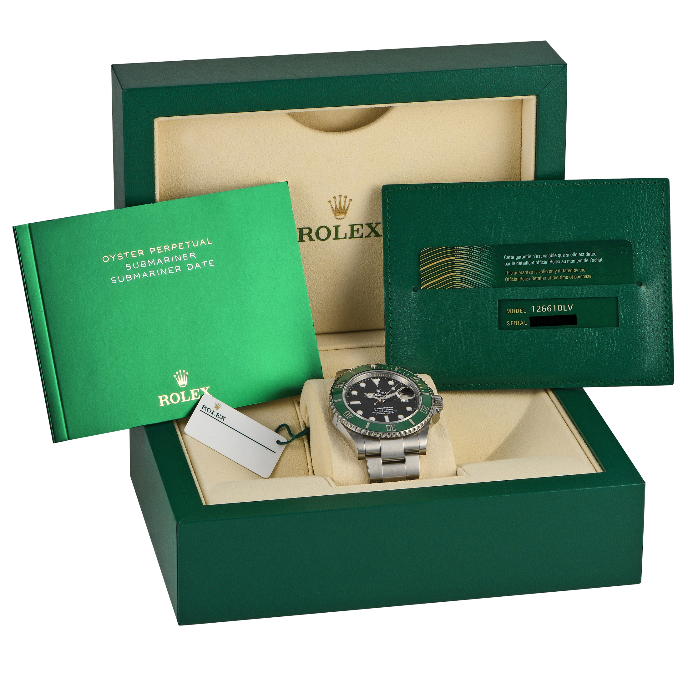 This is a pre-owned Rolex Submariner Date Watch 126610LV. It comes with papers and the manufacturer’s box.