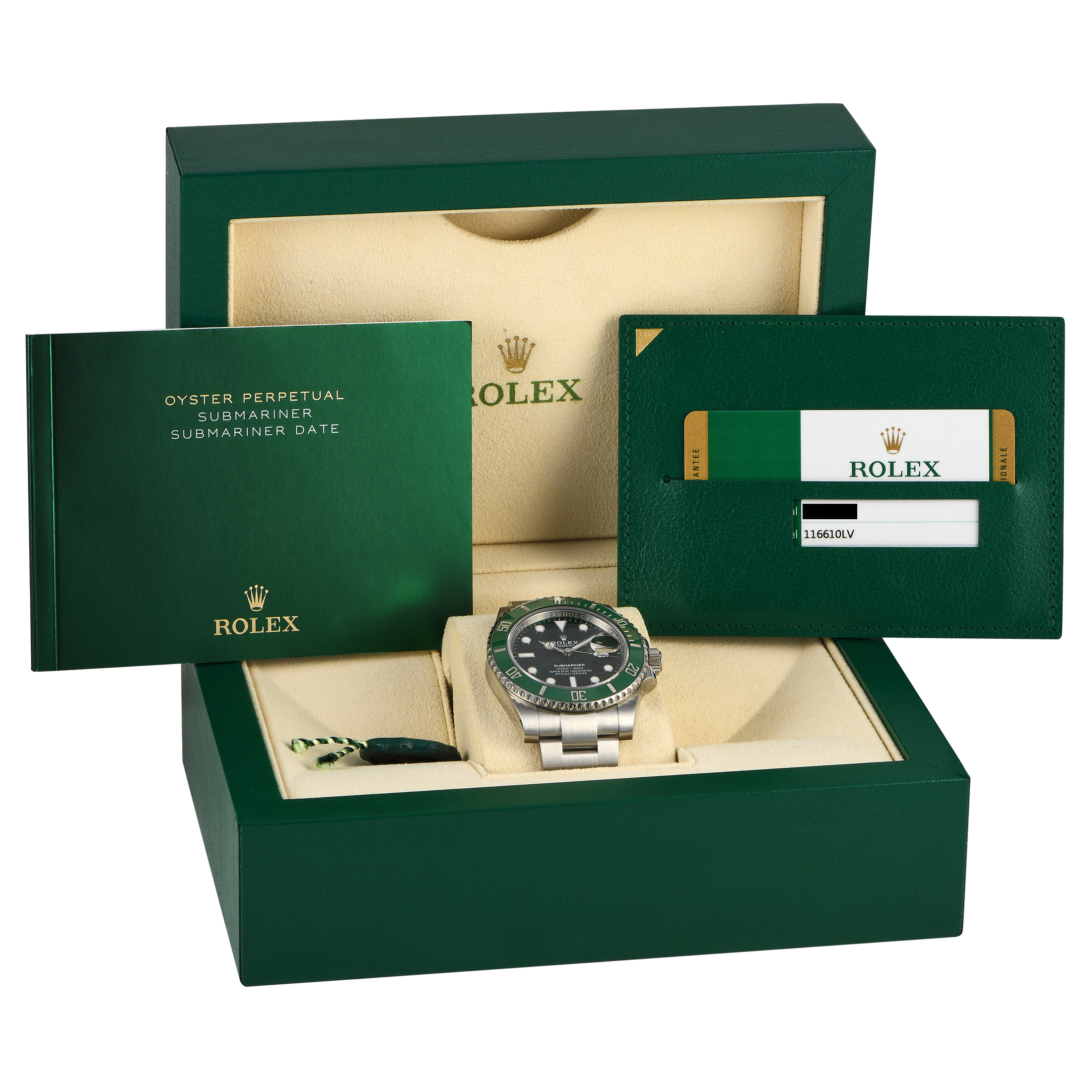 This is a pre-owned Rolex Submariner Date Hulk Watch 116610LV. It comes with papers and the manufacturer’s box.